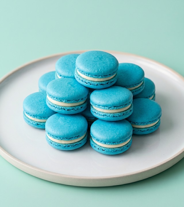 Macaronmasse in einen Spritzbeutel mit Lochtülle füllen und 40 gleich große Tupfen auf mit Backpapier ausgelegte Backbleche spritzen.