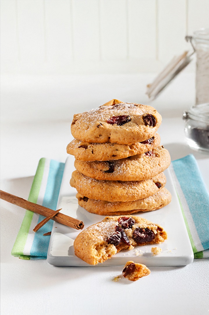 Nacheinander Cranberrys, Rosinen, Walnüsse, mit Backpulver vermischtes Mehl, ½ TL Zimt und Kardamom zugeben. Teig ½ Stunde kalt stellen.