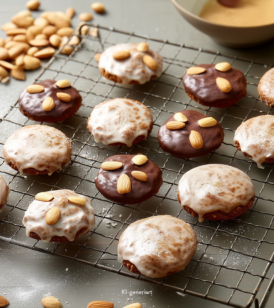 Die erkalteten Elisenlebkuchen mit Zuckerguss oder Schokoladenglasur bestreichen und nach Wunsch mit halben Mandeln verzieren.