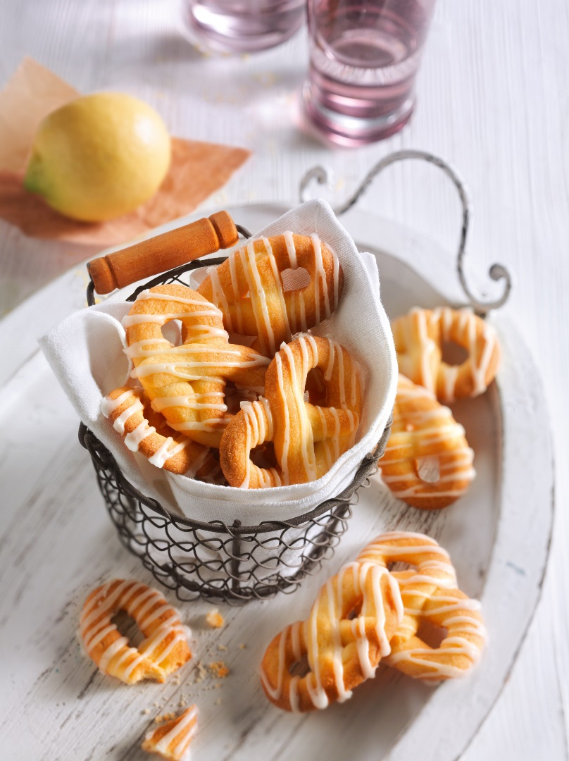 Diamant Puderzucker sieben, mit Zitronensaft zur Glasur anrühren und Brezeln nach dem Abkühlen damit überziehen.
