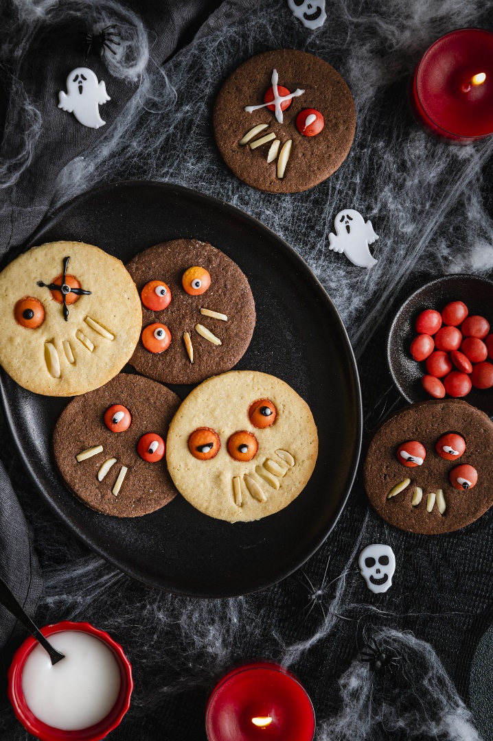 Runde Kekse (ca. 5 cm Durchmesser) ausstechen und auf ein mit Backpapier belegtes Blech legen. Mit Schokolinsen als Augen und Mandelsplittern als Zähne als Monster dekorieren.