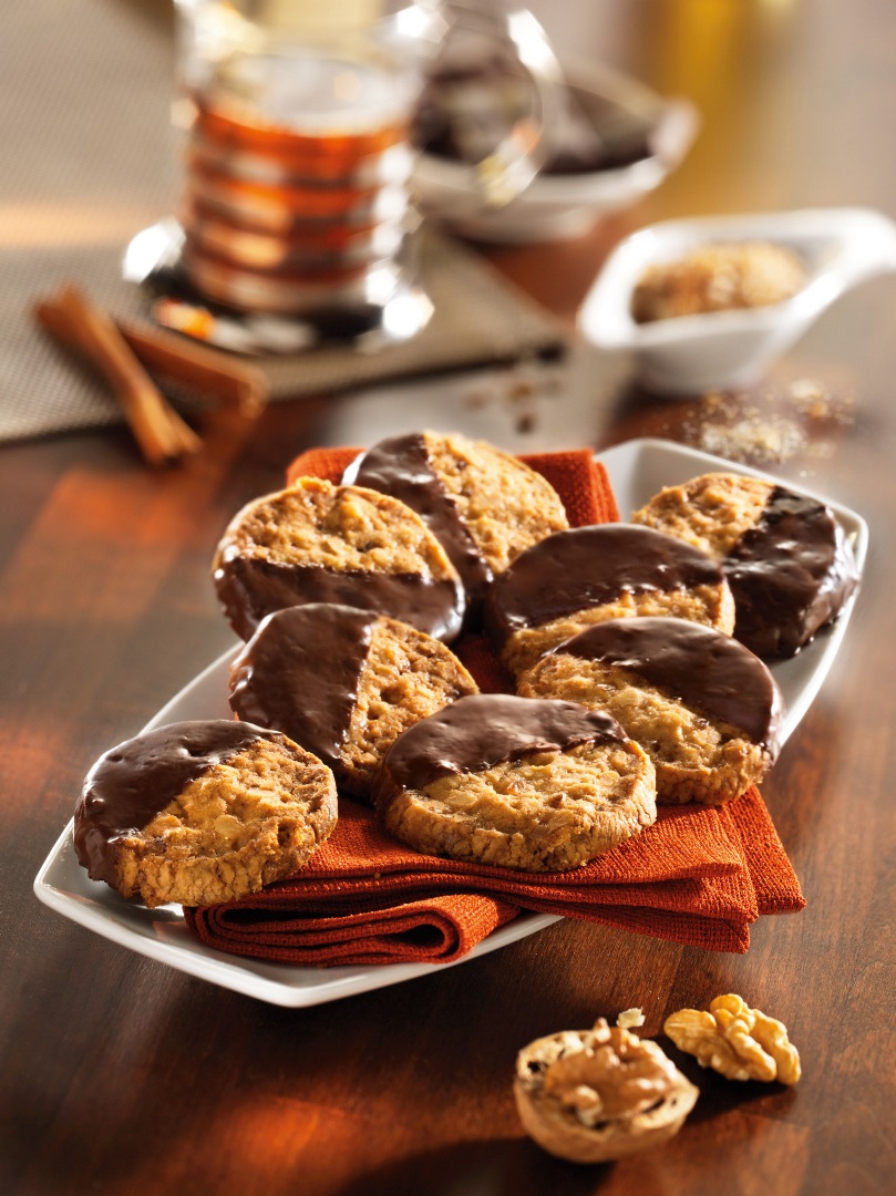 Plätzchen abkühlen lassen, dann bis zur Hälfte in flüssige Kuvertüre tauchen.