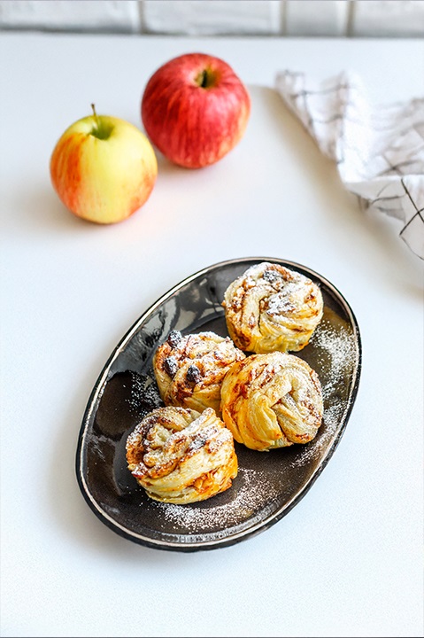 Den Blätterteig entsprechend der Apfelgröße zurechtschneiden. (Tiefkühlteig vorher etwas antauen lassen und ausrollen).