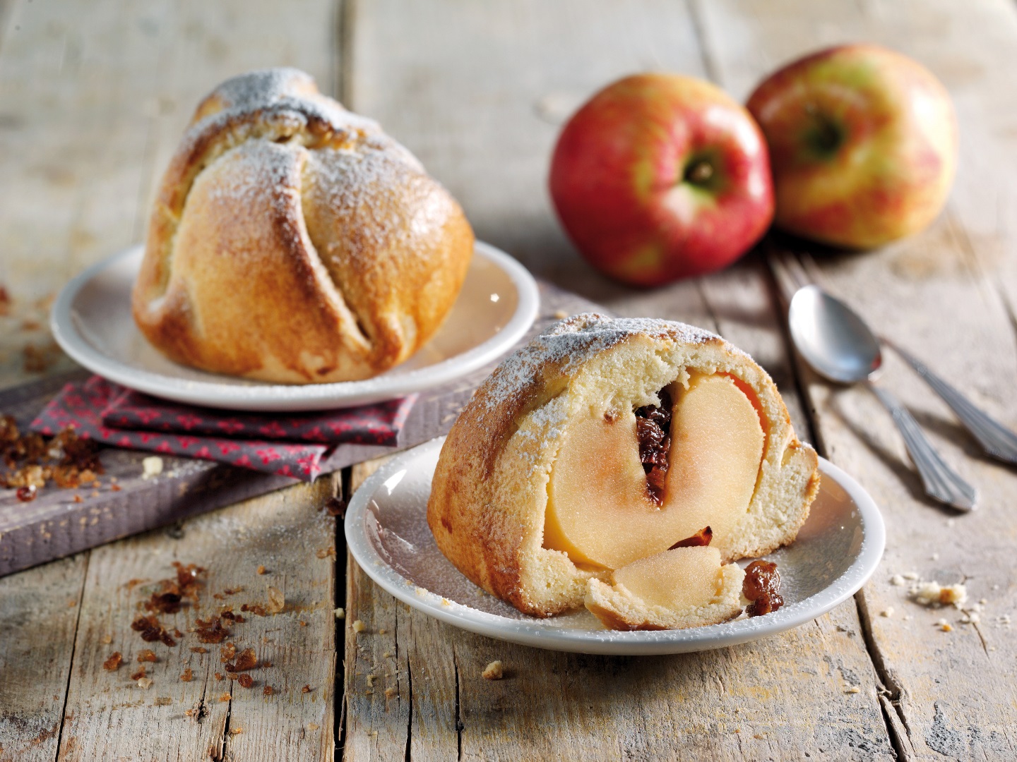 Je einen Apfel auf ein Teigstück setzen, den Teig gleichmäßig um die Äpfel legen und oben zusammendrücken. Auf ein mit Backpapier belegtes Backblech setzen. Eigelb mit Milch verquirlen und Teig damit bestreichen.