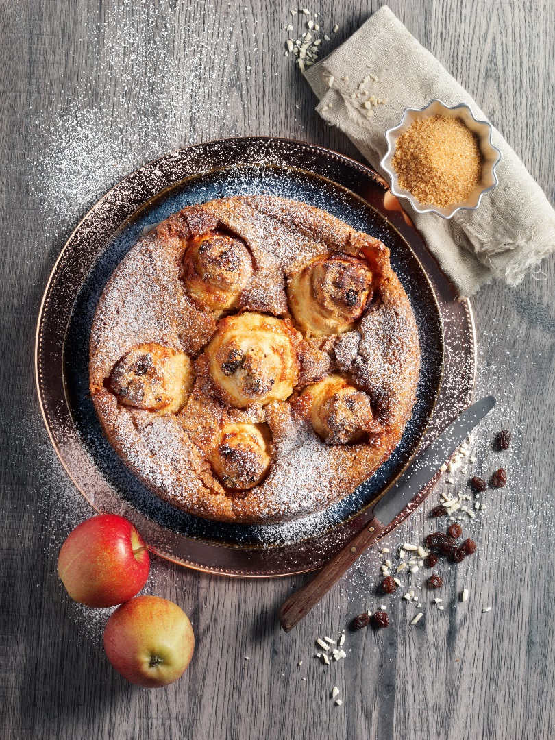 Äpfel schälen, Kerngehäuse entfernen und in den Teig setzen. Marzipan mit Diamant Puderzucker, Rosinen, gehackten Mandeln und Amaretto verkneten und Äpfel damit füllen. Das Marzipan, das nicht mehr in die Äpfel passt, zwischen den Äpfeln verteilen und Kuchen mit Diamant Brauner Zucker bestreuen.