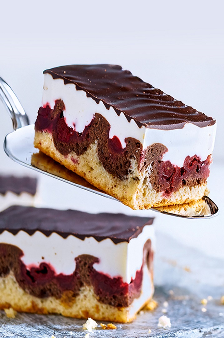 Die Hälfte des Teiges auf dem Blech verteilen. Restlichen Teig mit Kakao und Milch verrühren und oben auf dem hellen Teig verteilen. Teigoberfläche glattstreichen. Die Kirschen oben auf dem Teig verteilen.