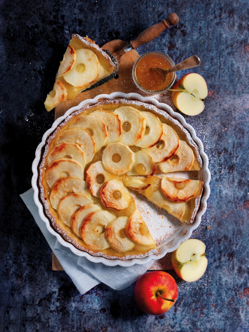 Boden aus dem Ofen nehmen, Erbsen und Backpapier herunternehmen. Apfelmus gleichmäßig auf dem Boden verstreichen und mit den Apfelscheiben belegen. Mit 2–3 EL Diamant Brauner Zucker bestreuen.