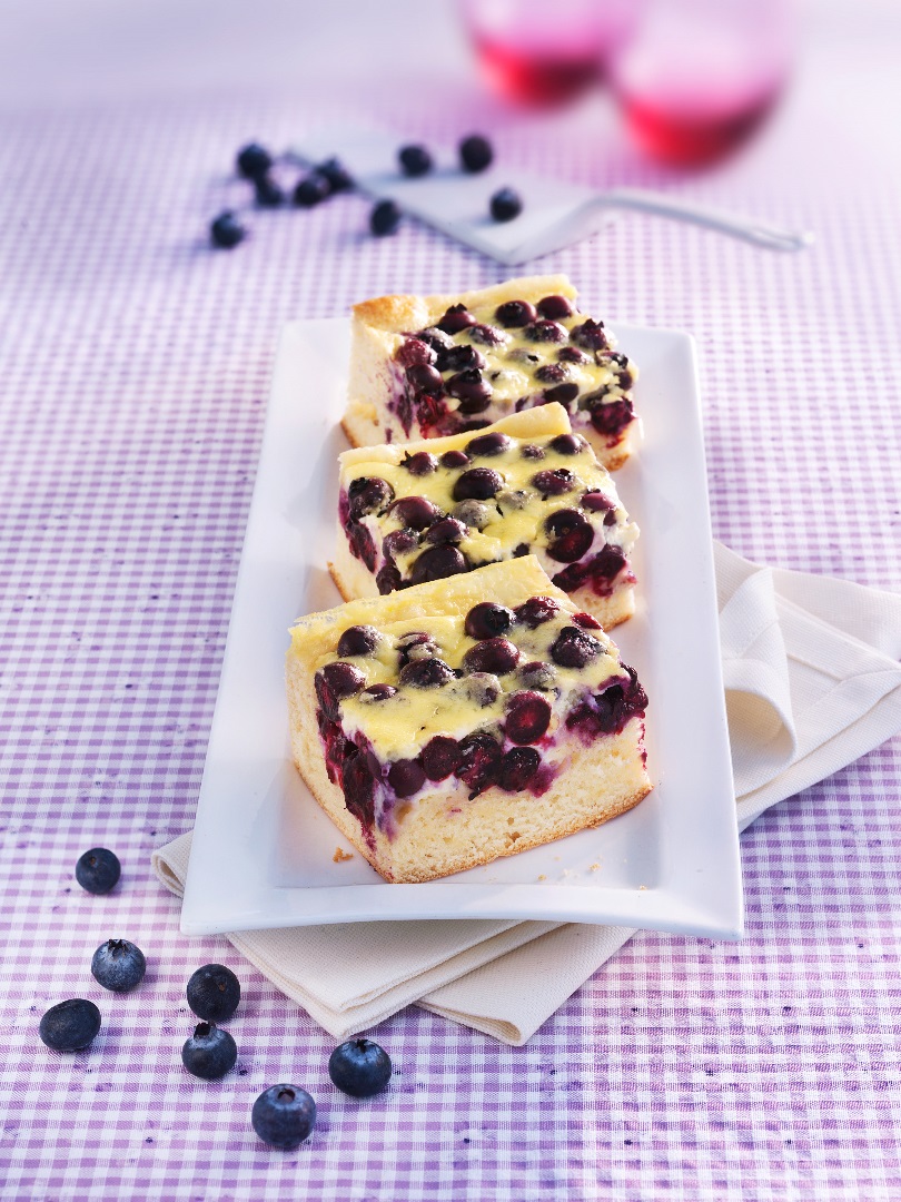 Klassischer Blechkuchen aus lockerem Hefeteig mit vielen Heidelbeeren und einem Guss aus saurer Sahne – herrlich beerig!