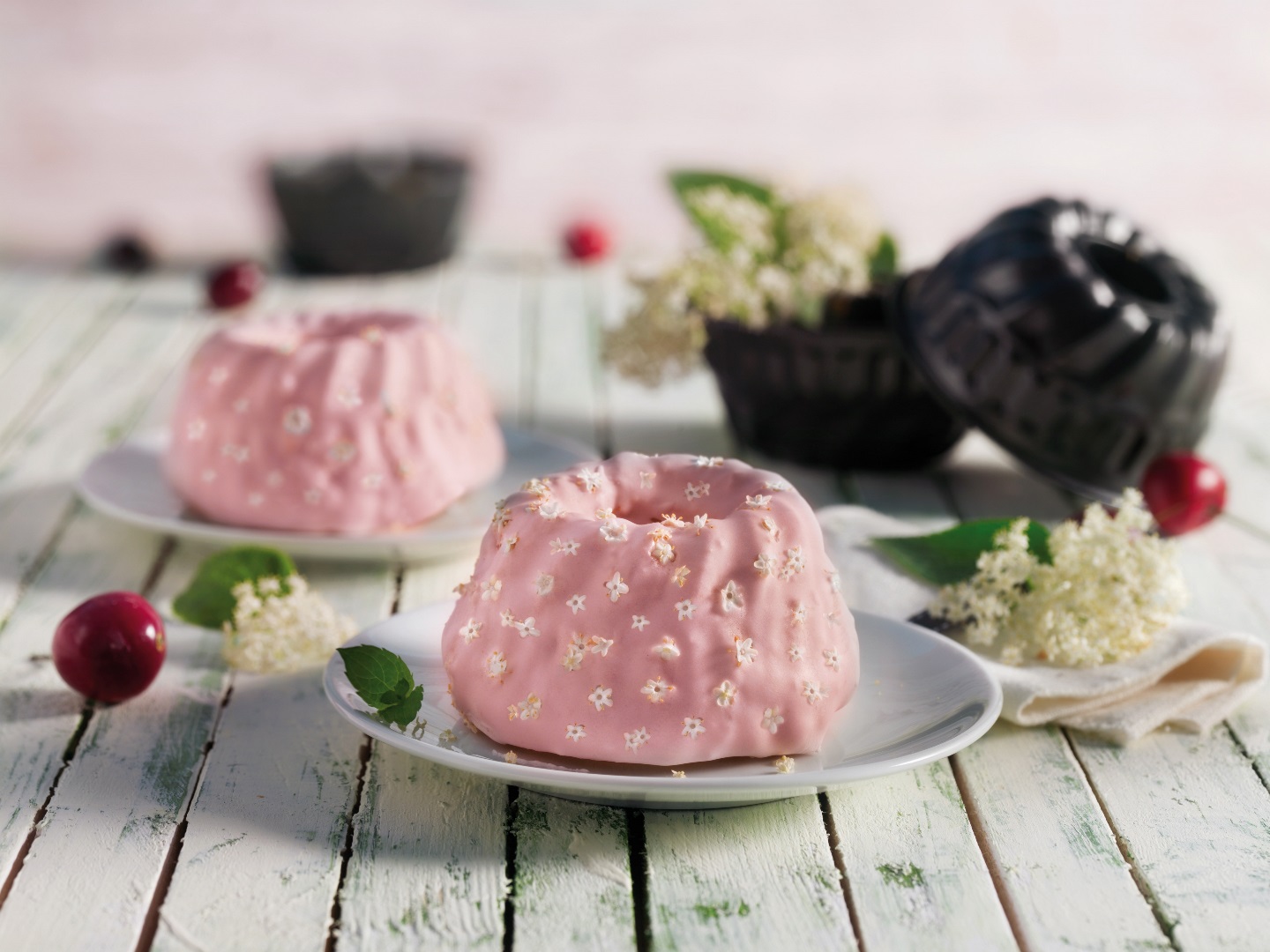 Diamant Puderzucker sieben, mit Kirschnektar verrühren und die Mini-Gugelhupfe damit bestreichen. Sofort mit einigen Holunderblüten bestreuen.