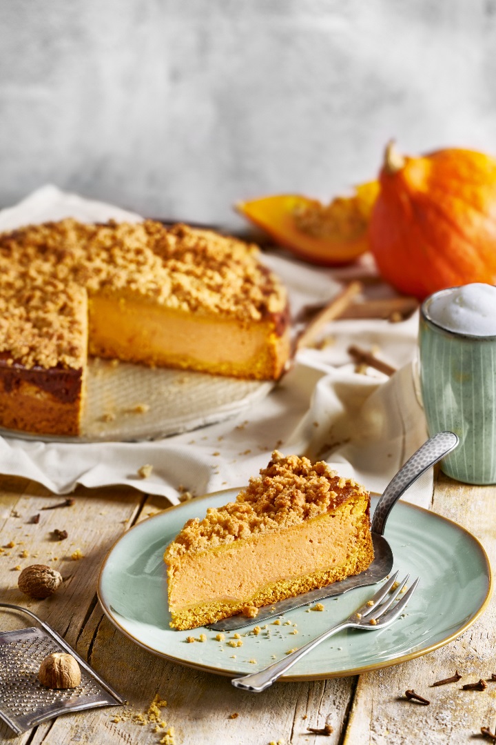 Der cremige Käsekuchen mit Kürbis im Belag und knusprig-würzigen Streuseln ist der Renner auf der herbstlichen Kaffeetafel!