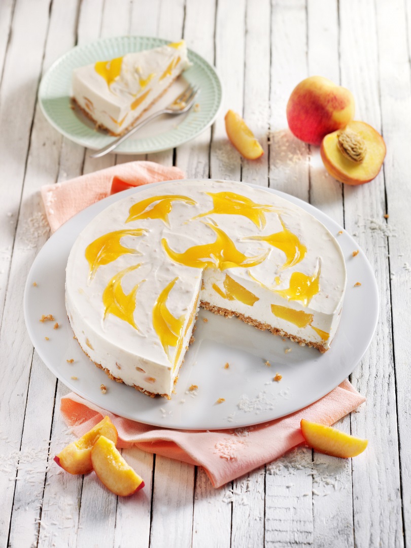 Aromatische Pfirsiche, Kokosraspeln und eine köstliche Frischkäsecreme machen diese Torte zu einem himmlischen Sommergenuss. Und das Beste: Der Ofen bleibt kalt!