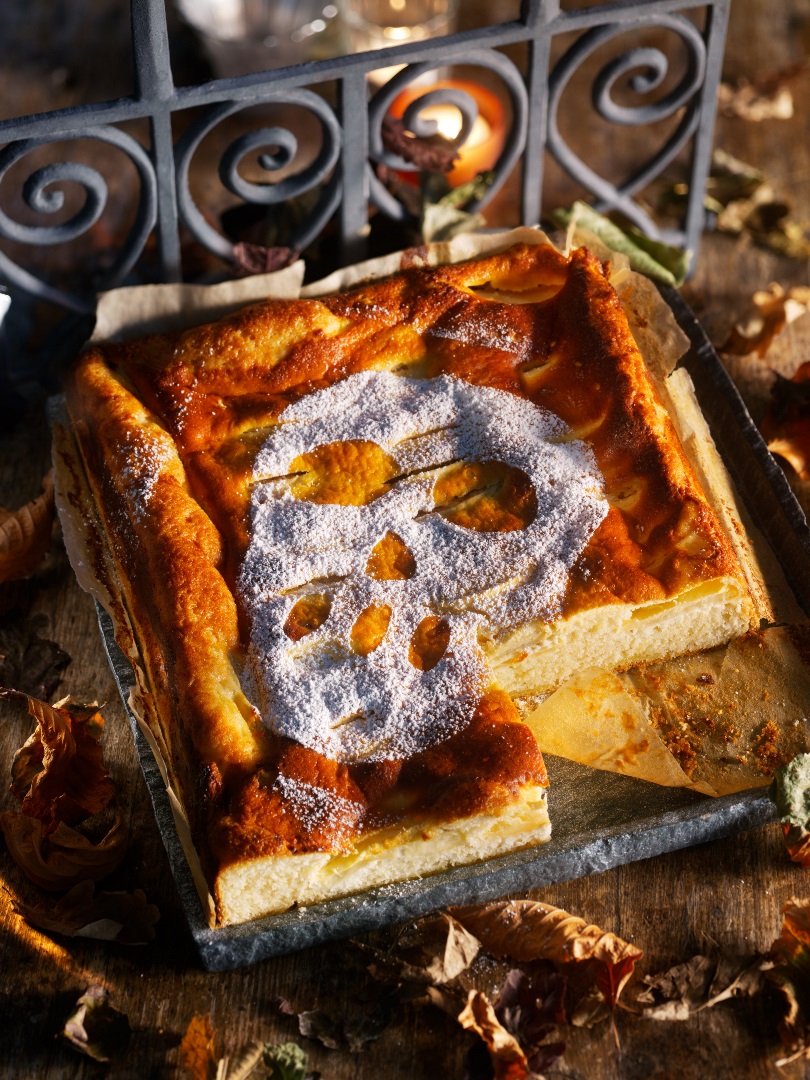Mörderisch saftig und schauerlich lecker: Apfelkuchen mit einem Guss aus saurer Sahne! Totenkopf-Vorlage dazu? Die gibt es hier.