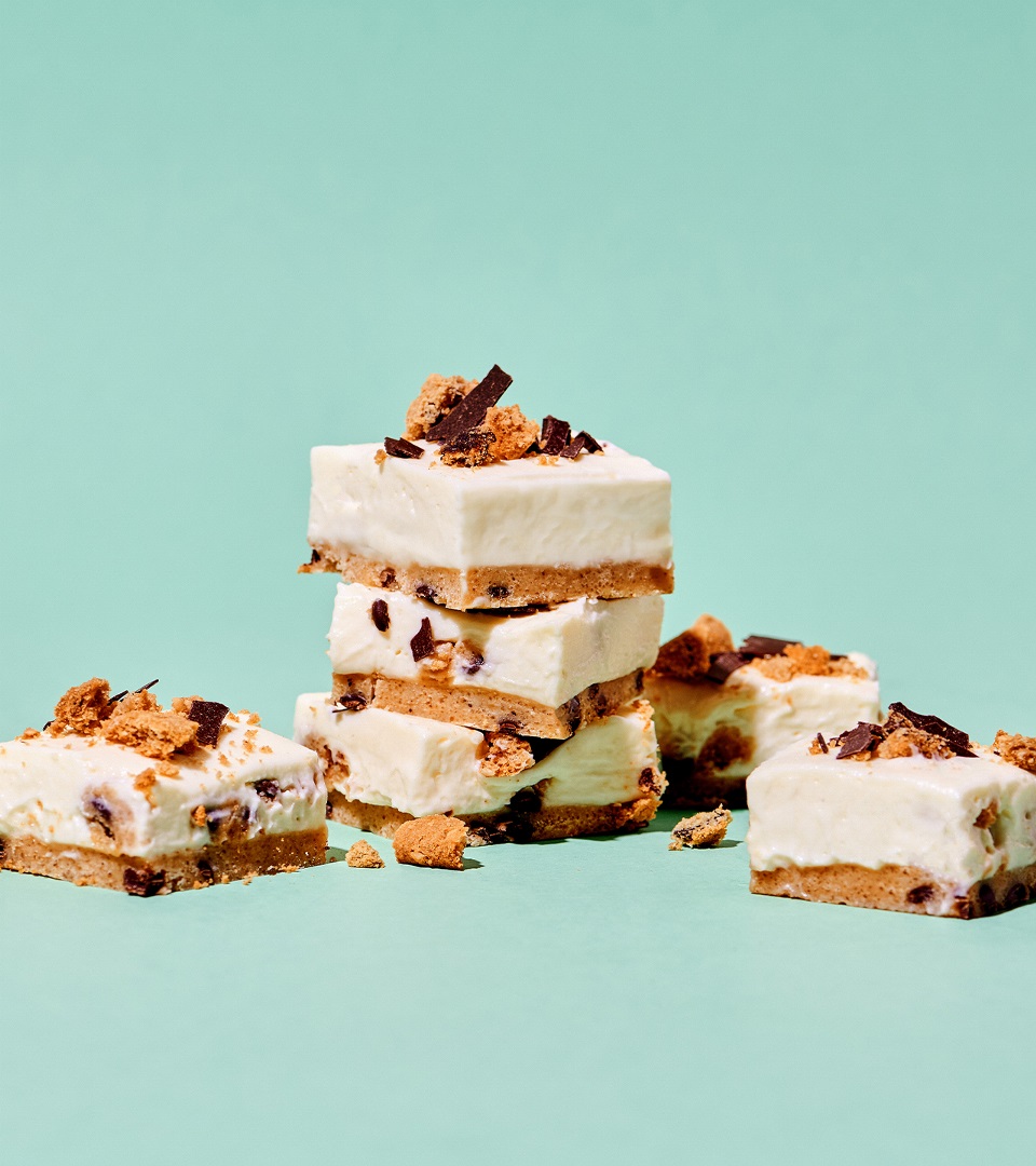 Die Hälfte der Frischkäsecreme auf dem Cookie-Dough-Boden verstreichen, den restlichen Cookie-Dough-Teig darauf krümeln und mit der restlichen Creme bedecken.