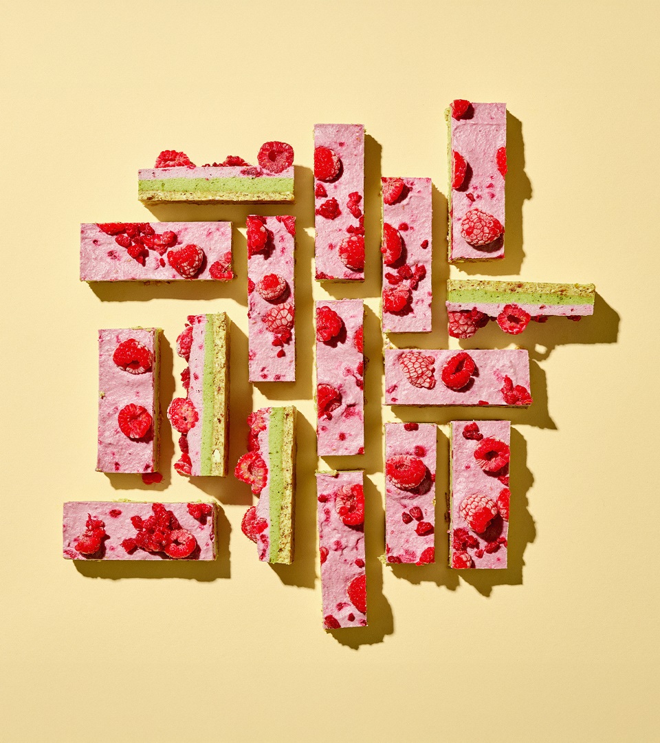 Die entnommene Masse mit gefriergetrockneten Himbeeren fein mixen und als zweite Schicht auf der Matcha-Schicht verteilen.