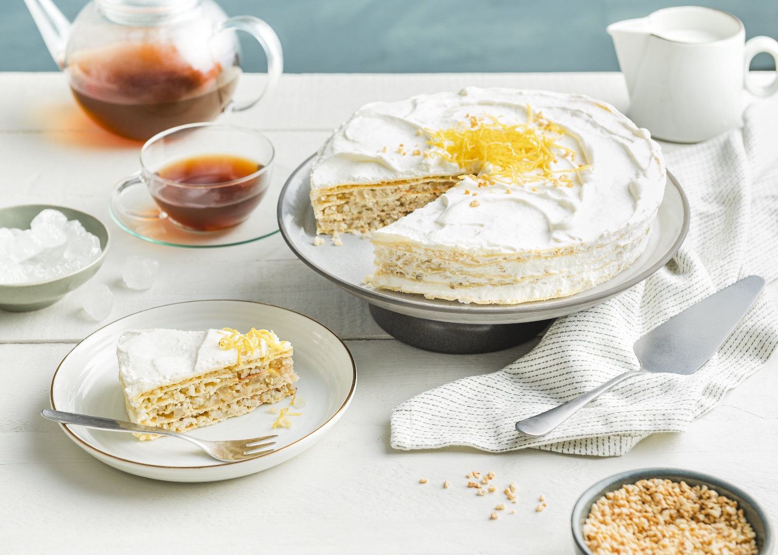Sahne mit einer Palette (oder einem Messer) halbdurchsichtig auf dem Rand der Torte verstreichen. Den Rest Sahne obendrauf verteilen und mit Mandeln und Zitronenzesten verzieren.