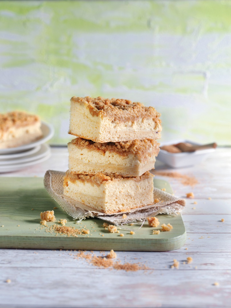 Die Streusel auf der Quarkmasse verteilen, und den Kuchen noch einmal 15 Minuten gehen lassen.