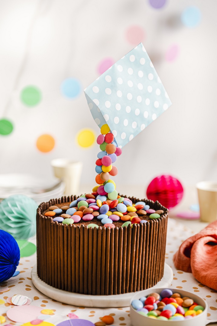 Einen Glasstrohhalm mit dem Knick nach oben leicht schräg in die Mitte des Kuchens stecken und einige Schokolinsen mit dem Zuckerguss daran kleben. Die Schokolinsen auch auf die Oberseite des Kuchens streuen.