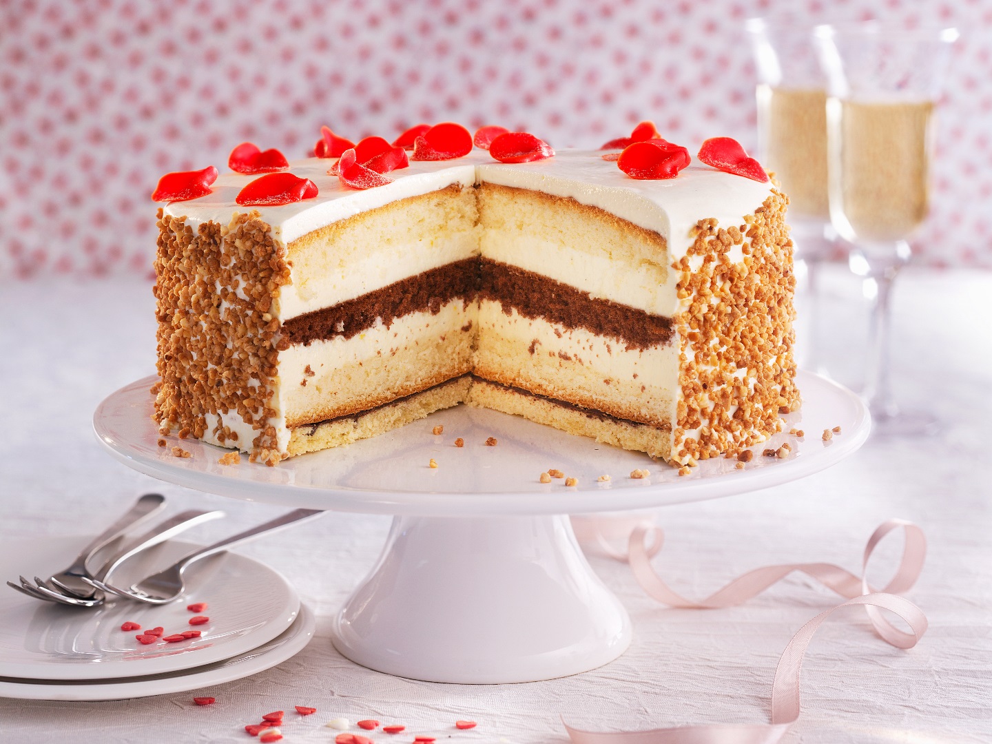 Marzipan mit Lebensmittelfarbe einfärben und Rosenblätter daraus formen. Torte damit dekorieren und rundherum mit Haselnusskrokant verzieren.