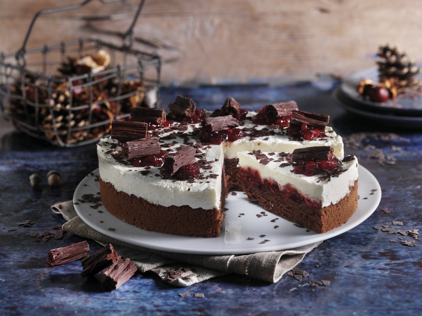 Den kalten Kuchen mit 3/4 der Preiselbeeren bestreichen. Sahne mit Vanillezucker steif schlagen und auf den Preiselbeeren verteilen. Mit Borkenschokolade und Preiselbeerklecksen verzieren.