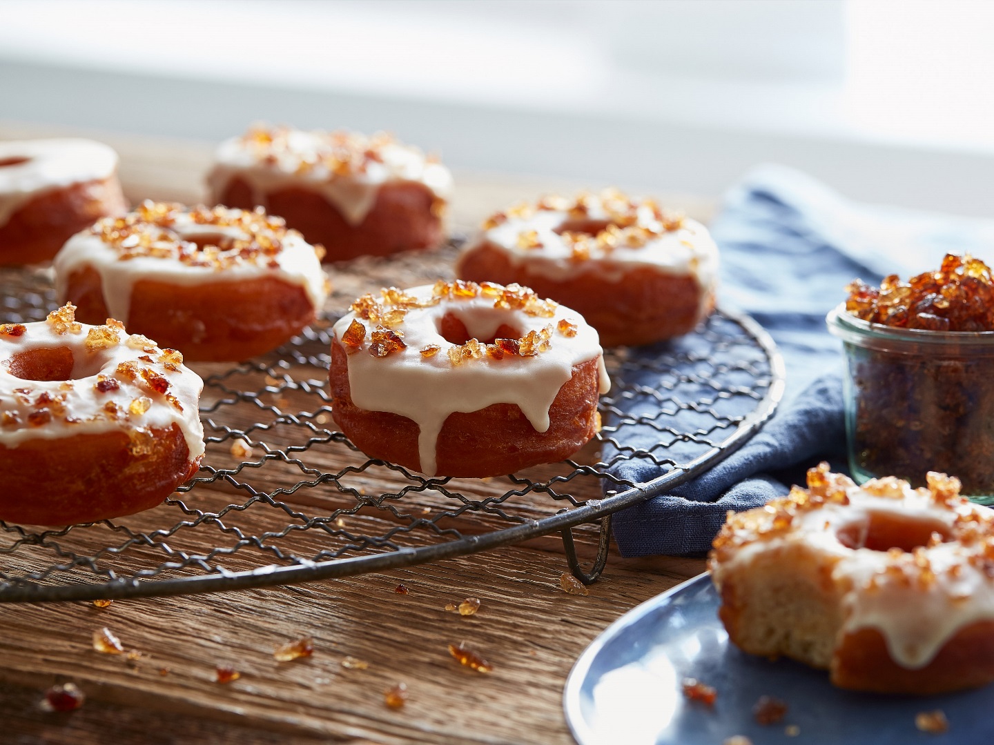 Donuts mit dem Frosting einpinseln, sofort nach Belieben mit Diamant Grümmel Kandis bestreuen und 10 Minuten trocknen lassen.
