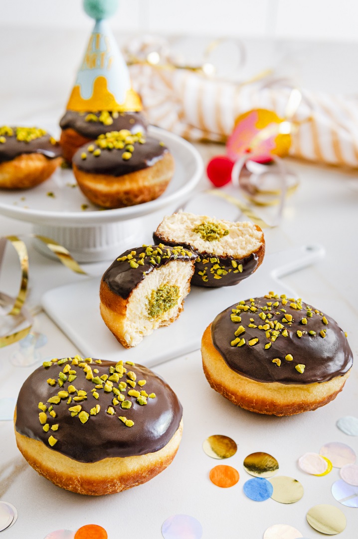 Für die Füllung Pistaziencreme mit Tahin und Diamant Rübenzucker und optional 2–3 EL Milch zu einer glatten, spritzfähigen Masse verrühren. Das Engelshaar fein zerkrümeln und unter die Füllung mischen.