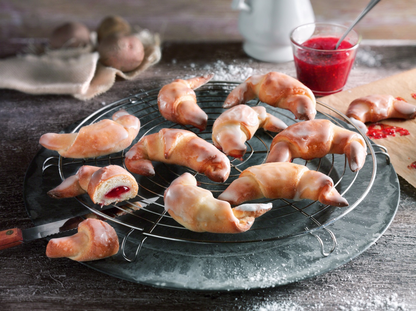 Diamant Puderzucker sieben und mit Zitronensaft zur Glasur anrühren. Die Hörnchen noch heiß damit bestreichen.