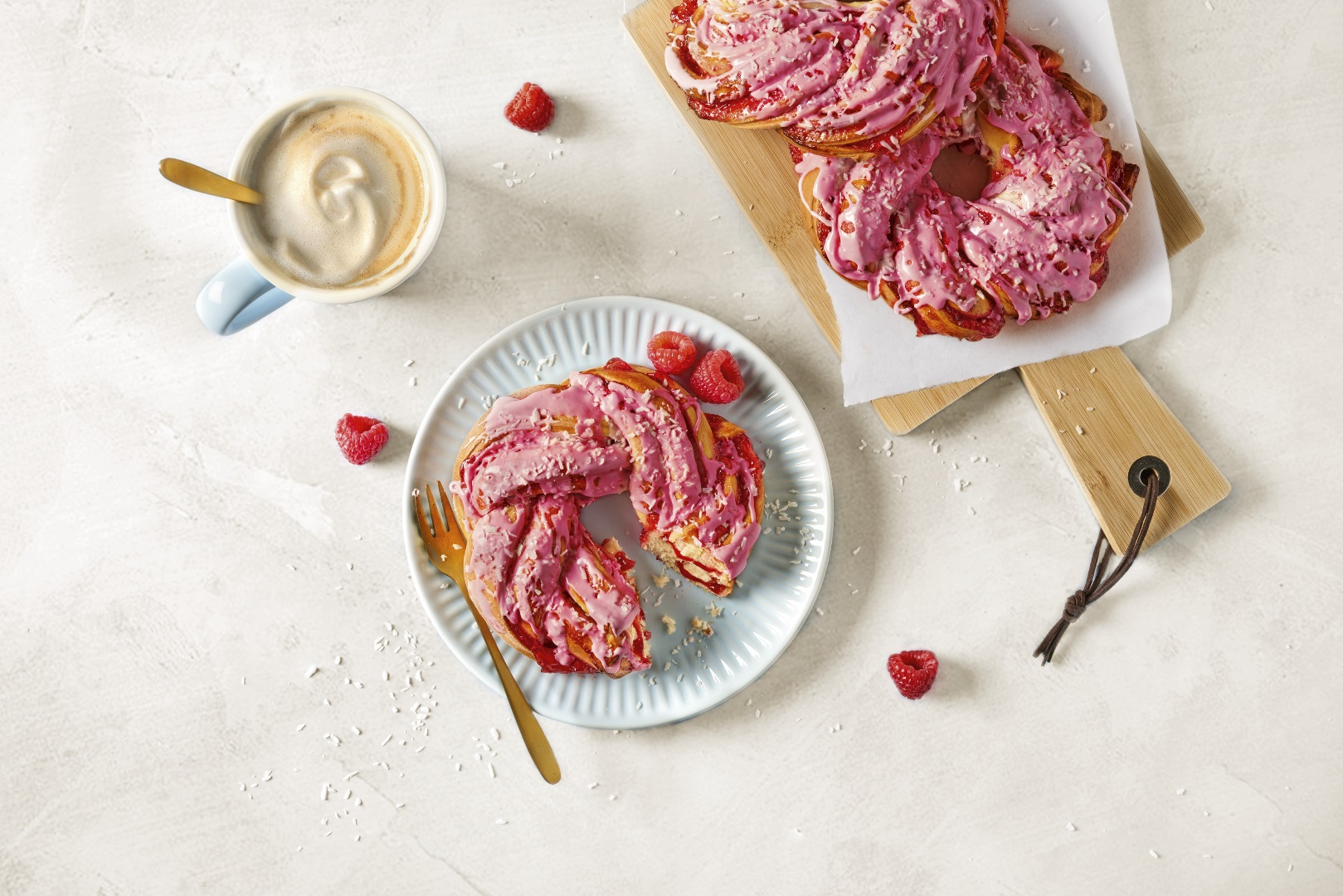 Kleine Hefekränzchen mit geswirlter Himbeer-Füllung