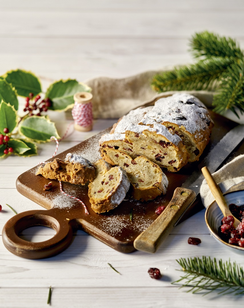 Teig halbieren und zu zwei Stollen formen: zunächst rundlich-längliche Laibe formen. Mit der Teigrolle etwa die Hälfte des Stollens über die lange Kante etwas flachrollen. Den dickeren Teil darüberschlagen und den Laib mit den Händen nochmal zurechtformen.