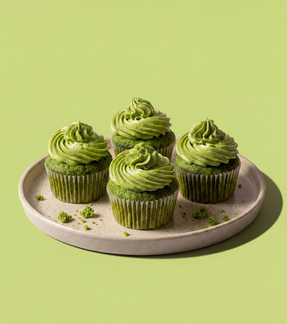 Ein leichtes Bestäuben mit gesiebtem Matcha-Pulver oder einige frische Beeren setzen einen frischen Akzent und sorgen für einen harmonischen Kontrast zur ausgewogenen Süße. Auf einer Etagere angerichtet werden die Cupcakes zum stilvollen Mittelpunkt der Kaffeetafel.