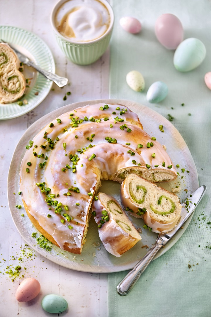 Diamant Puderzucker sieben, mit Wasser zur Glasur anrühren und den Kranz noch warm damit bestreichen. Mit restlichen Pistazien bestreuen und abkühlen lassen.