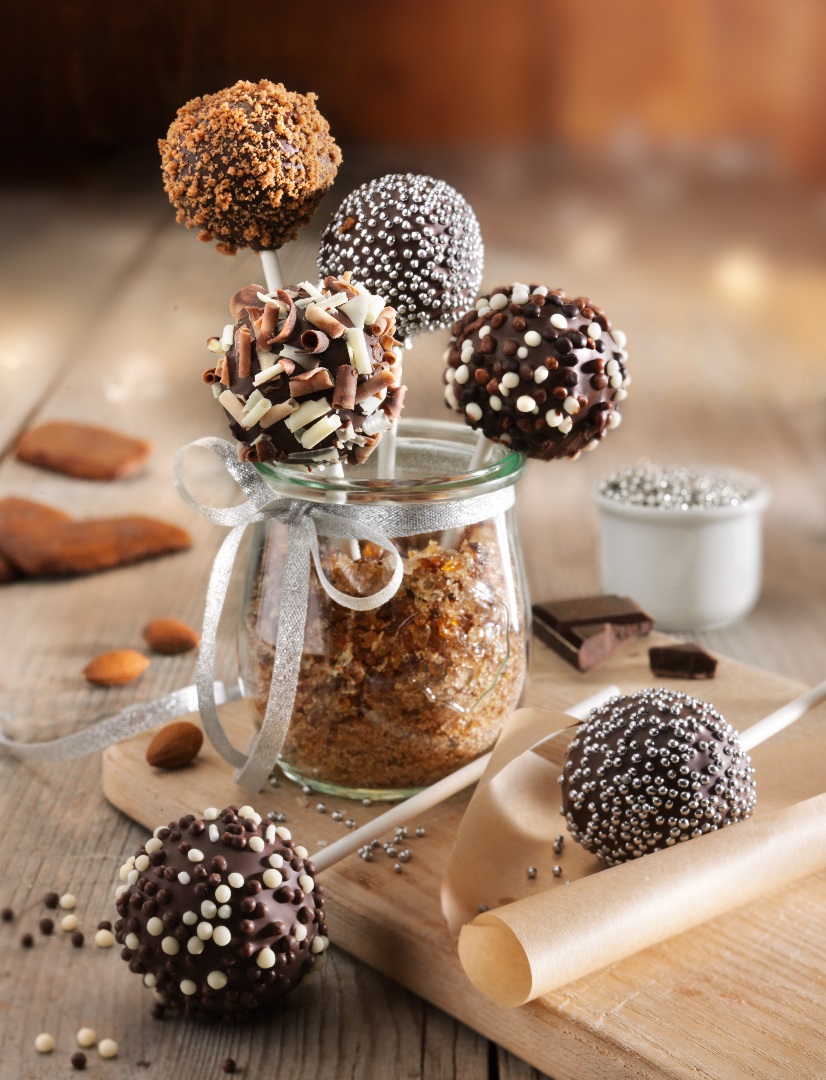 Zartbitter-Kuvertüre grob zerkleinern und im heißen Wasserbad schmelzen. Cake-Pop-Stiele ca. 1 cm hineintauchen und jeweils 1 Stiel in eine Kugel stecken. Erneut 15 Minuten in den Kühlschrank stellen.