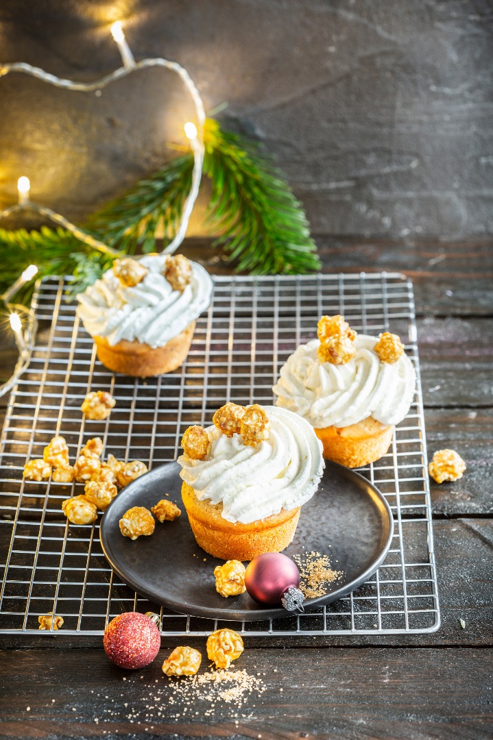 Zum Servieren Puderzucker sieben und mit Butter, Frischkäse und Kardamom zu einer Creme verrühren. Creme in einen Spritzbeutel mit Sterntülle füllen und auf die ausgekühlten Muffins spritzen. Popcorn auf den Cupcakes verteilen und servieren.