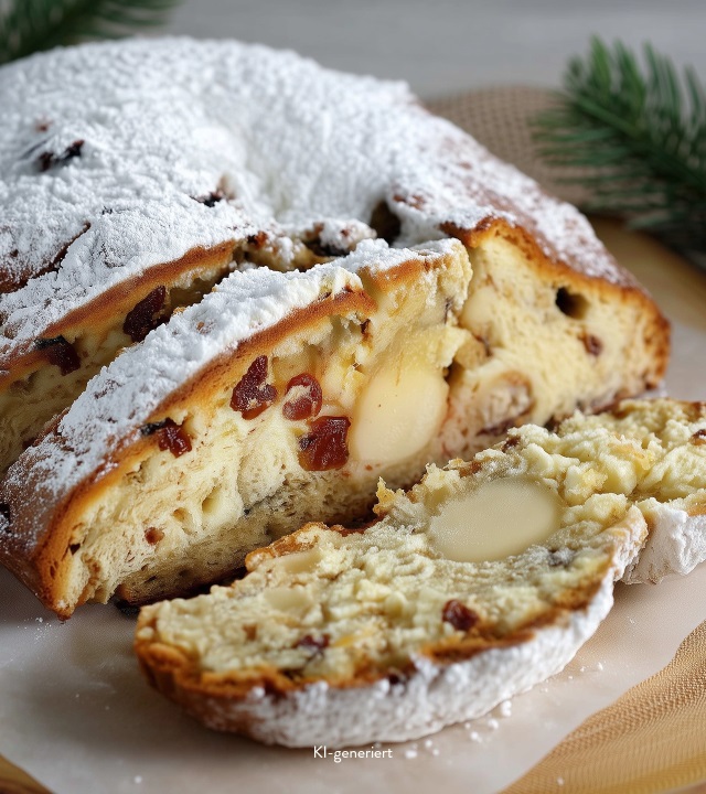 Butter zerlassen, Stollen sofort nach dem Backen damit bestreichen und mit Zucker bestreuen. Nach dem Erkalten dick mit Puderzucker bestäuben.