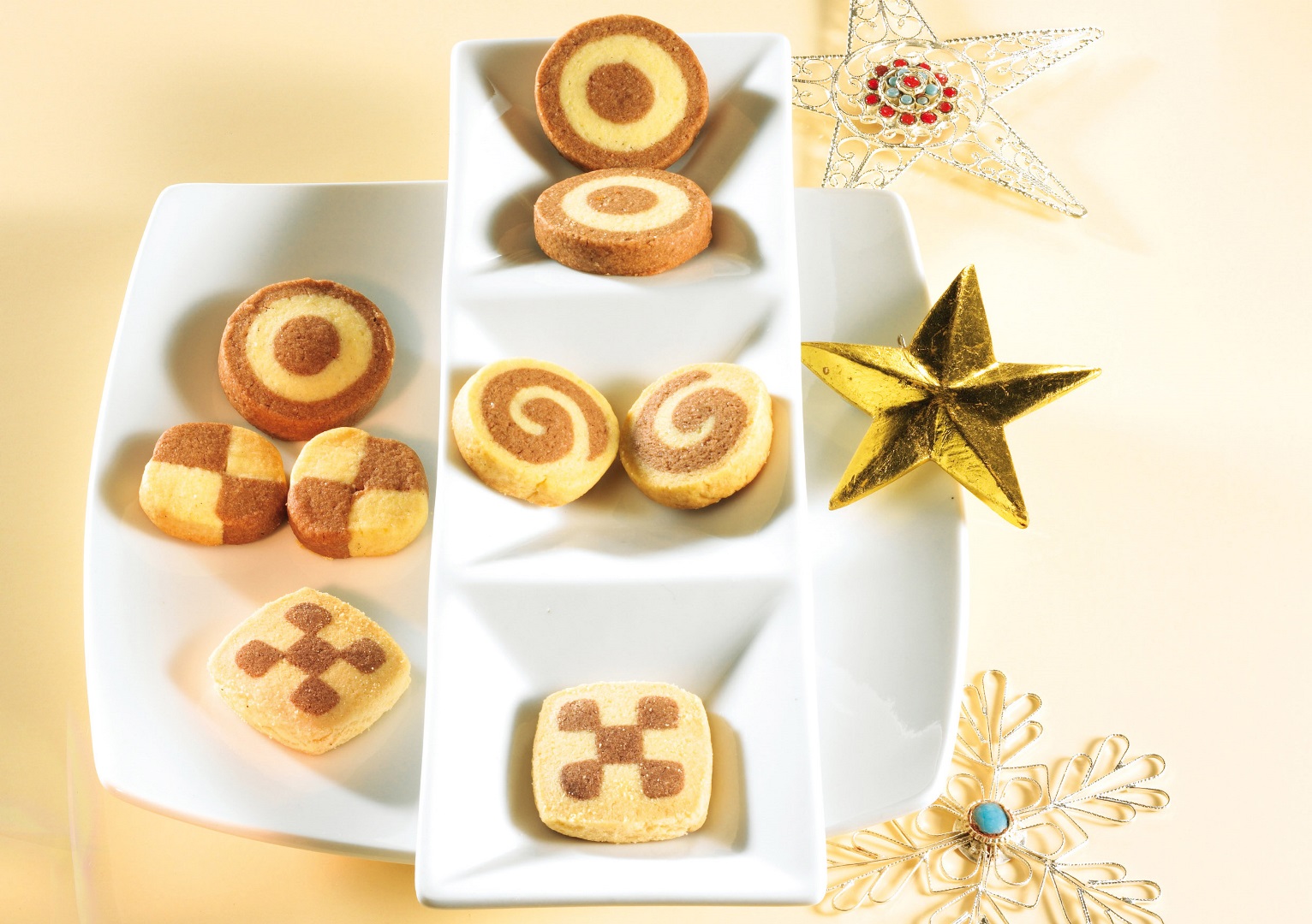 Für das Gebäck mit Schachbrettmuster die beiden Teige in schmale Streifen schneiden. Jeweils 9 Streifen als langes Rechteck stapeln und mit einem hellen oder dunklen Stück Teig umwickeln. Nach dem Kaltstellen in Scheiben schneiden und wie oben beschrieben backen.