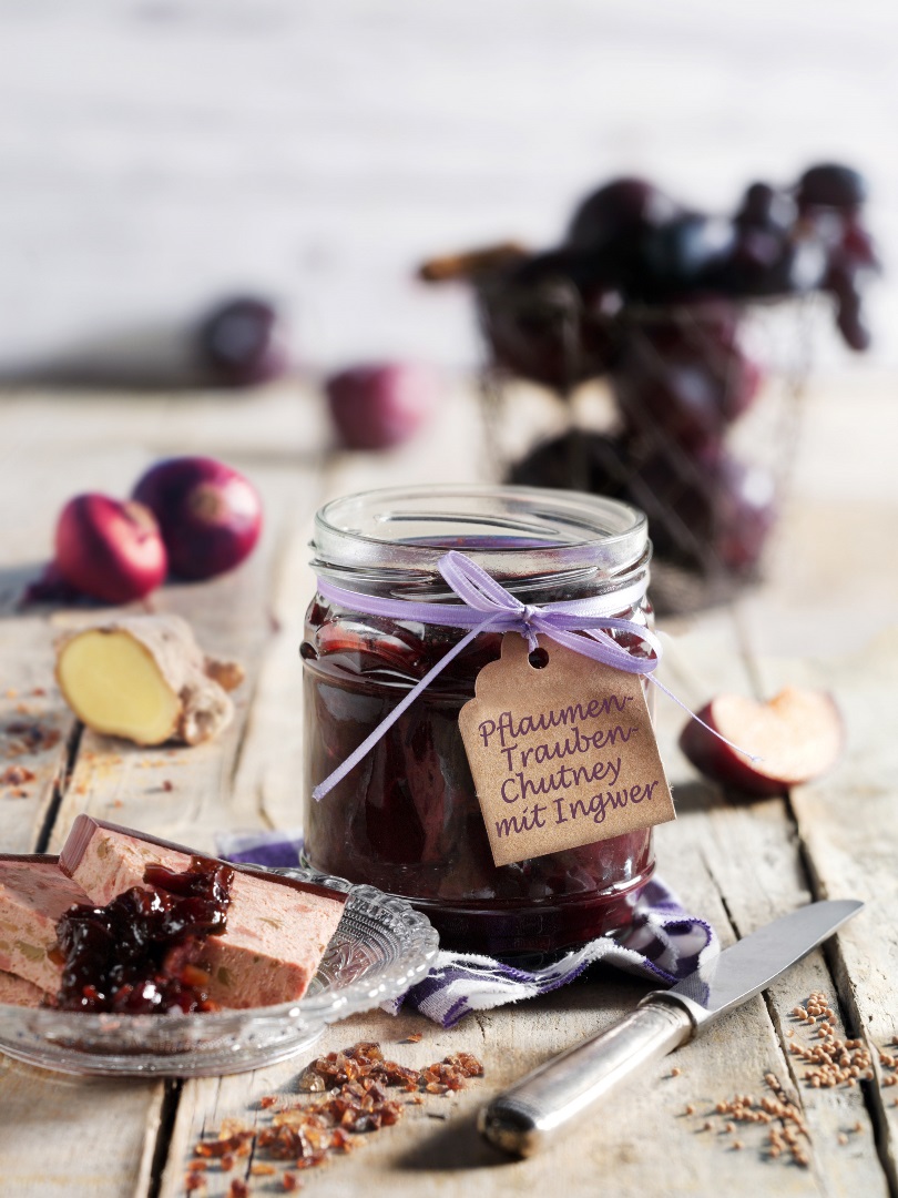 Das Chutney aus Pflaumen, blauen Trauben, roten Zwiebeln, getrockneten Cranberrys und frischem Ingwer schmeckt hervorragend zu gebratenem Fleisch und Käse.