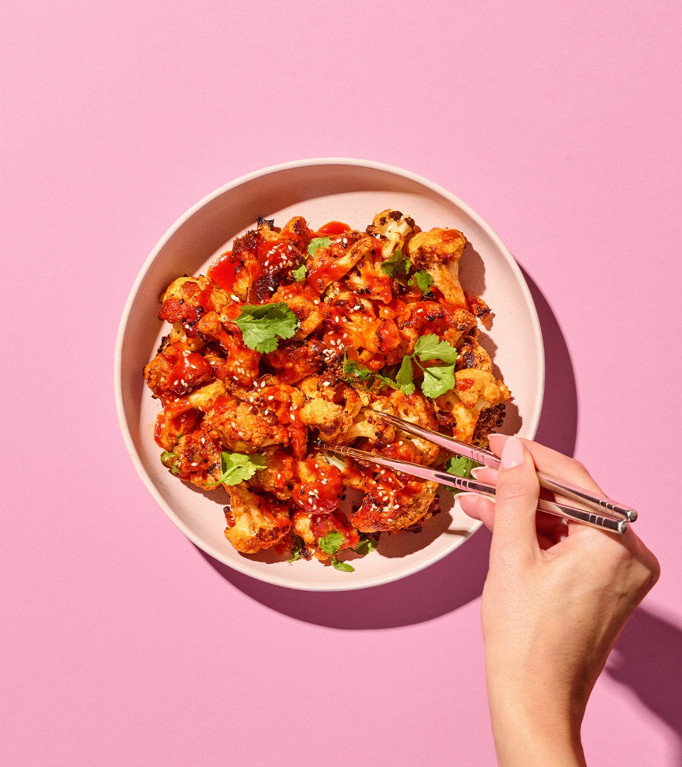Die gebackenen Blumenkohlröschen mit der Hälfte der Gochujang-Sauce bestreichen und weitere 10 Minuten backen, bis sie schön karamellisiert und knusprig sind.