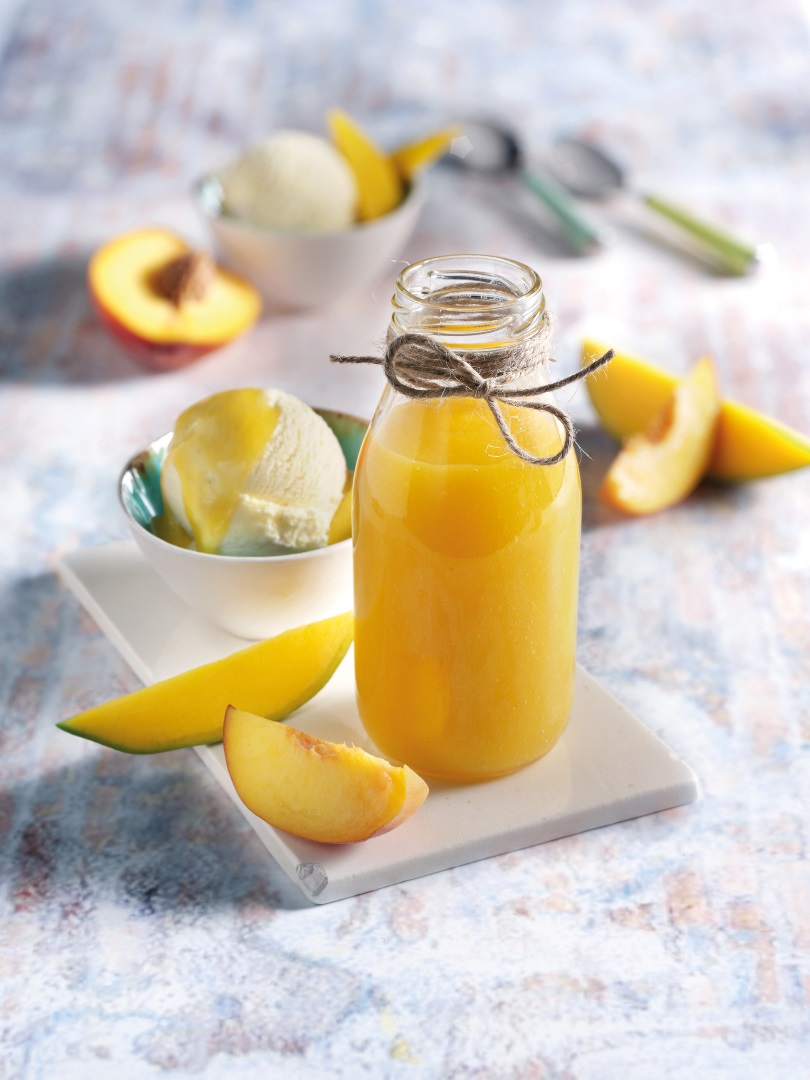 Mango schälen, Fruchtfleisch vom Kern schneiden, in Stücke schneiden und in ein hohes Gefäß geben. Zitronensaft auspressen und Mango damit beträufeln. Pfirsiche waschen, entsteinen, in Stücke schneiden und dazugeben.
