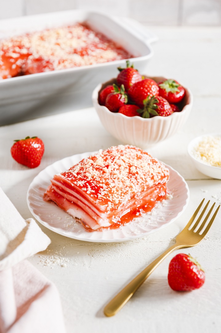 Weiße Schokolade raspeln und Erdbeer-Lasagne damit verzieren.