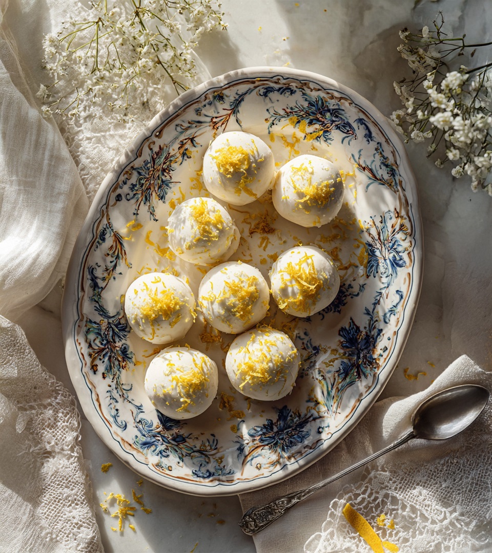 Die Bällchen mit der Schokolade überziehen. Die Zitronenzeste als Topping auf die Lemon Bites geben.