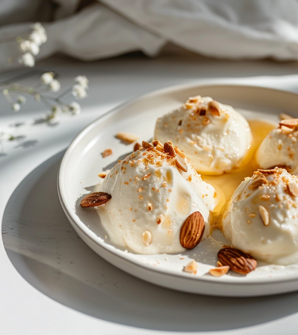 Zum Servieren Creme in Nocken auf Dessertteller verteilen und mit Mandeln bestreuen.