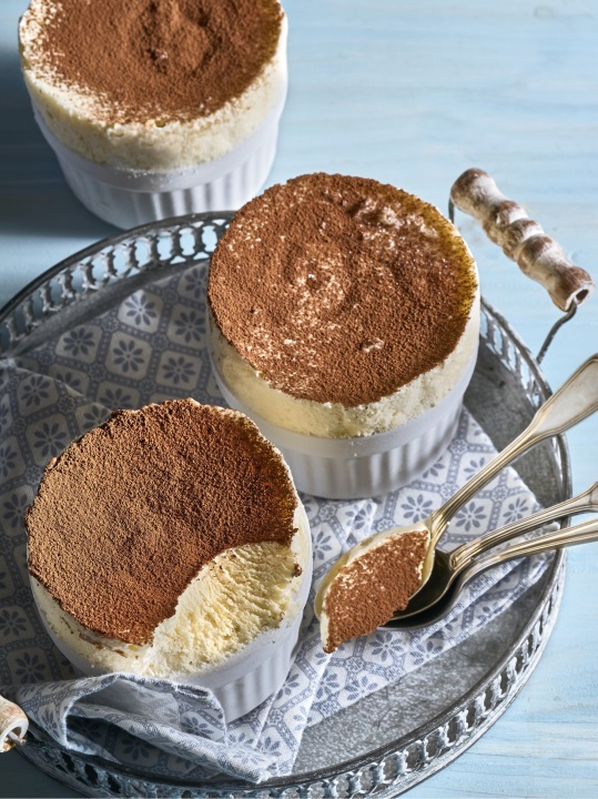 Zum Anrichten das Marzipan-Parfait in den Förmchen servieren oder stürzen und mit Kakaopulver bestäubt servieren.