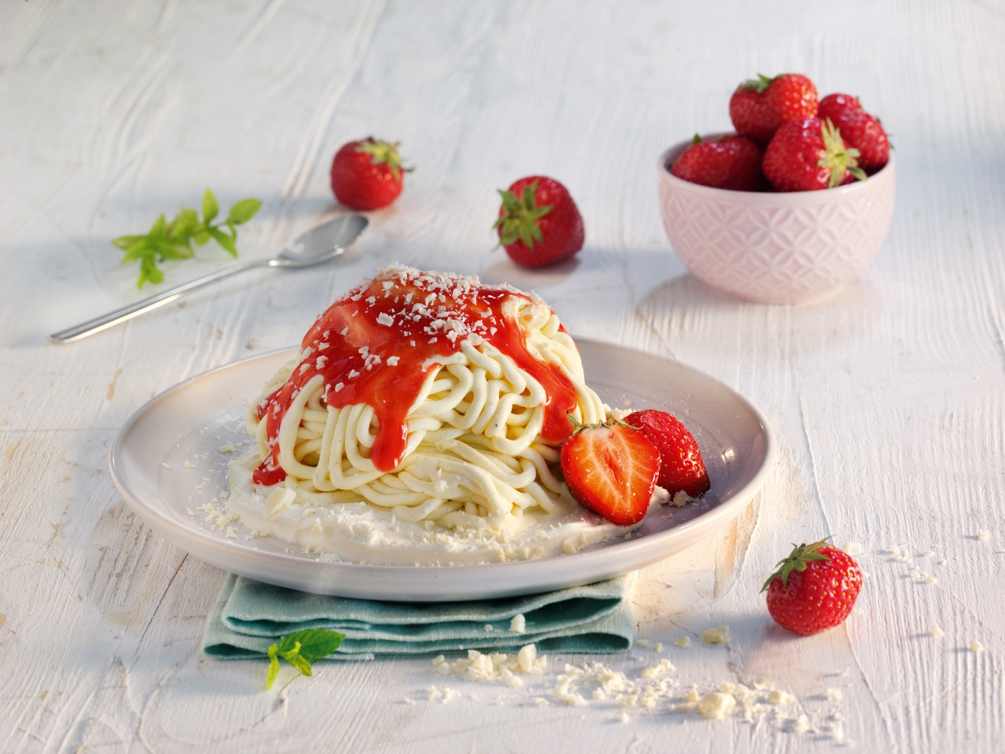 Zaubere mit unserem Rezept für Spaghetti-Eis den allseits beliebten Sommer-Klassiker aus Vanilleeis, Erdbeeren, Sahne und weißer Schokolade bei dir zu Hause!
