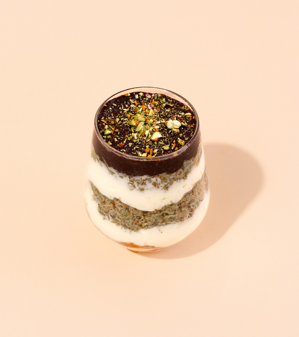 Zum Schluss die Dessertgläser schichten. Eine Schicht der Mascarpone-Sahne-Creme darauf geben, etwas von der abgekühlten Pistazienmischung gleichmäßig auf der Creme verteilen und wiederholen. Das Schokotopping darüber geben. Mit gehackten Pistazien garnieren und die Desserts für mindestens eine Stunde kaltstellen.