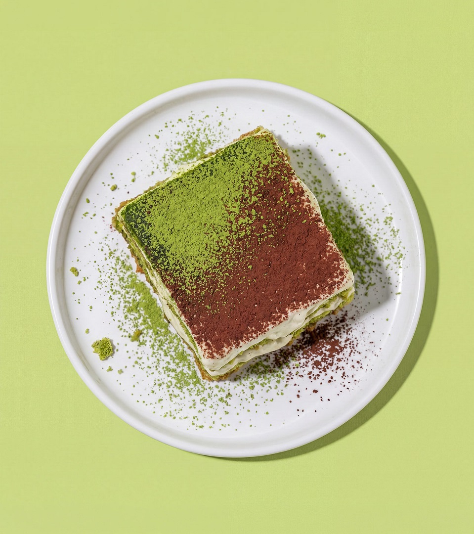 Zum Servieren das Tiramisu mit Matcha-Pulver verzieren.