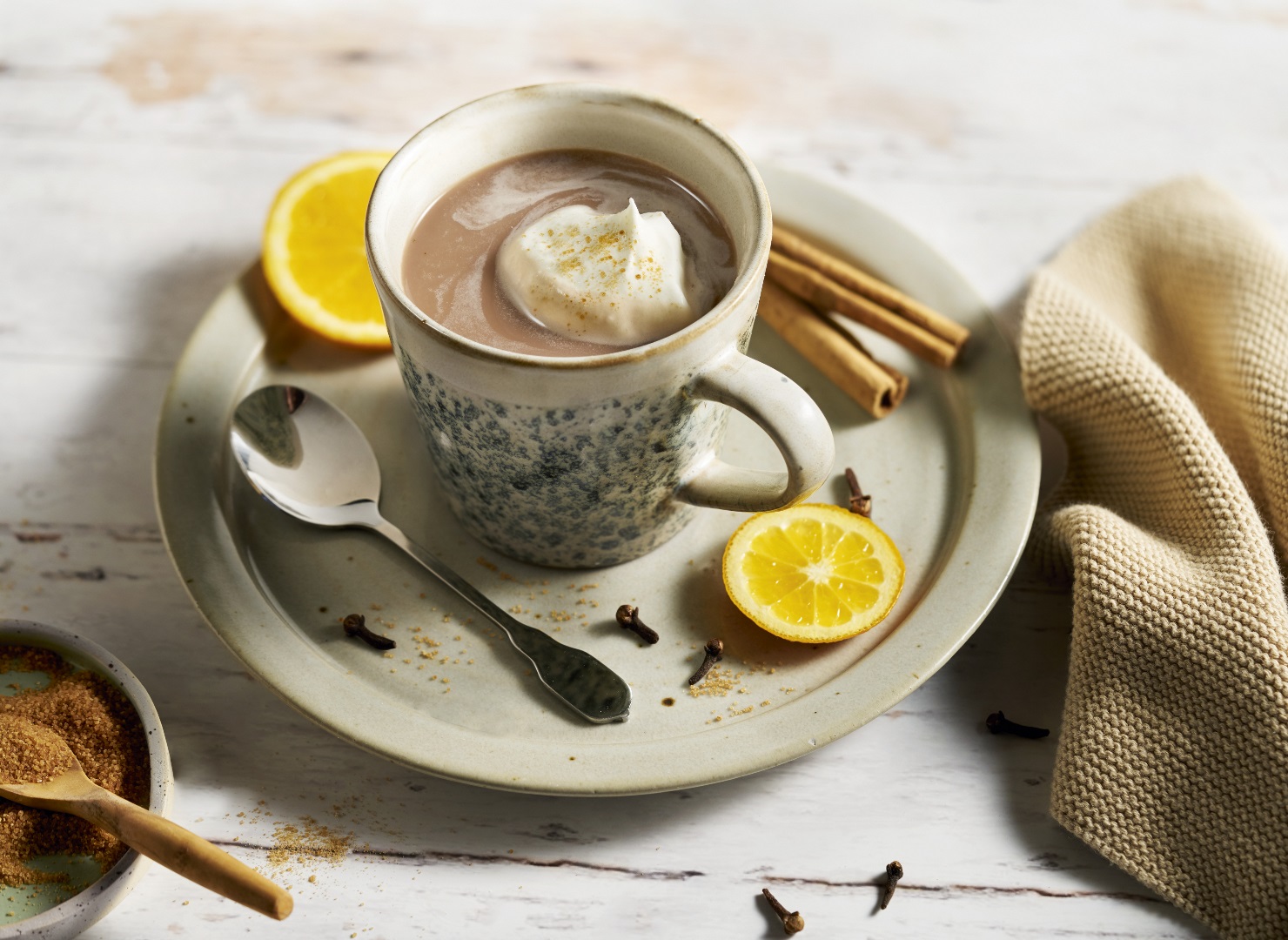 Milch mit Kakao, Orangenschale, Gewürzen und Diamant Coffee Sugar erhitzen und 10 Minuten ziehen lassen.