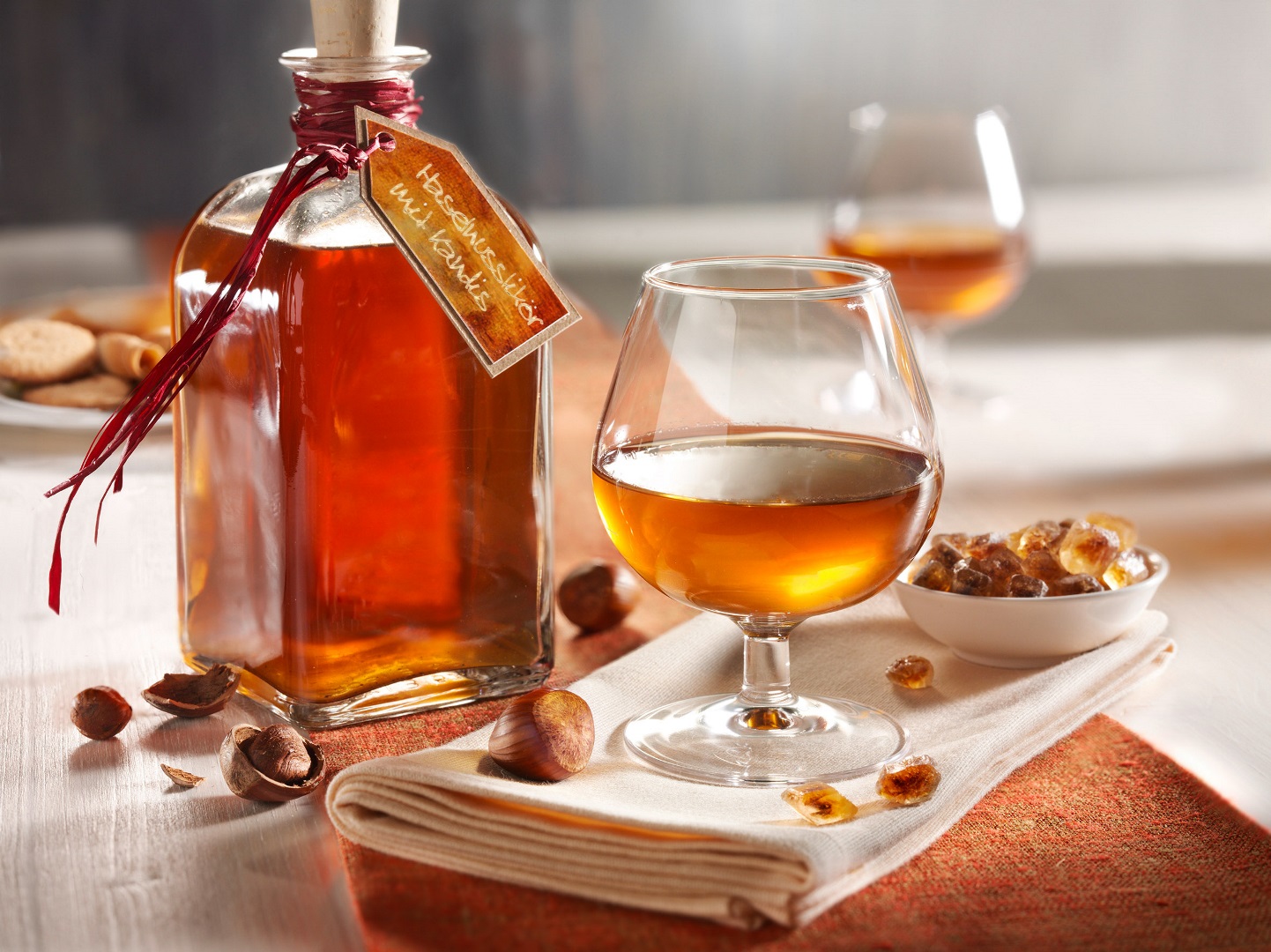 Haselnüsse häuten: dazu bei leichter Hitze in einer Pfanne rösten und anschließend in einem Trockentuch abreiben. Gehäutete Haselnüsse gut zerkleinern und in ein weithalsiges, verschließbares Gefäß füllen.
