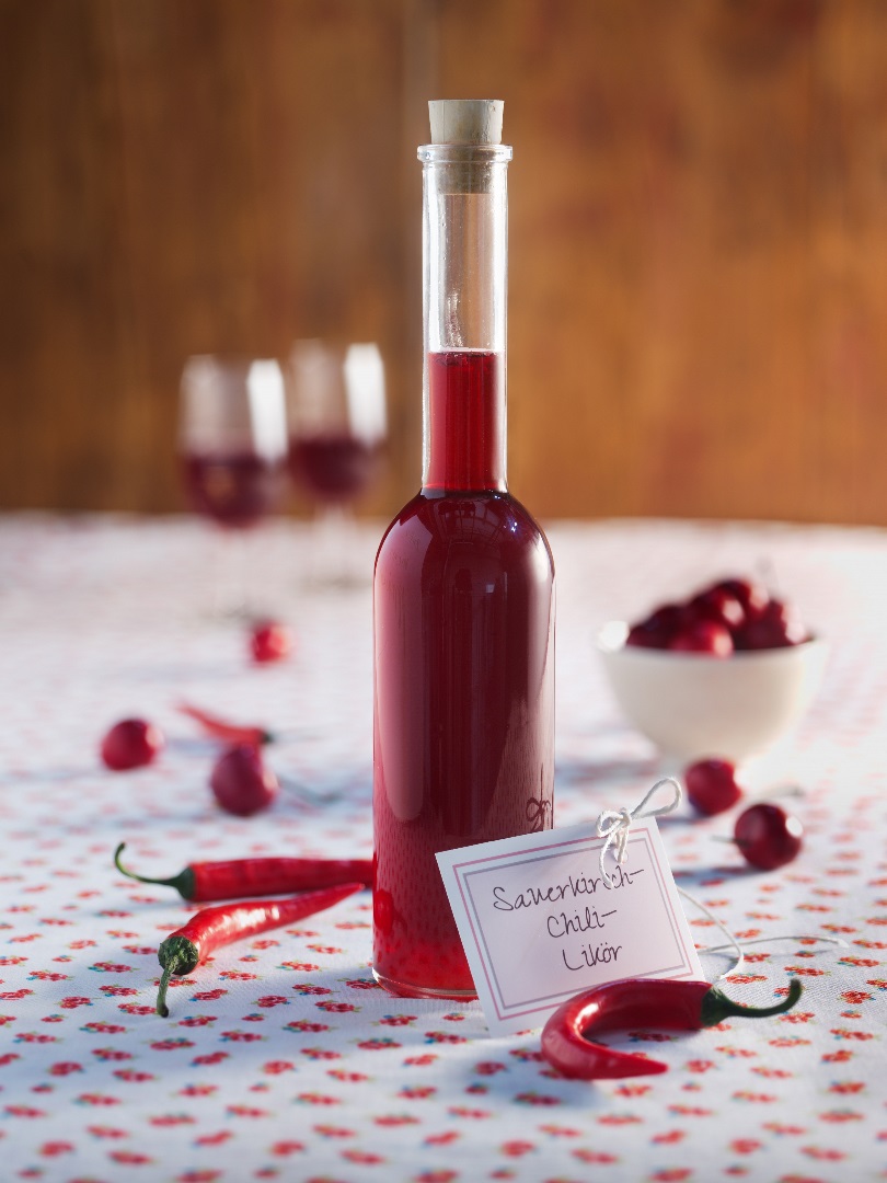 Kirschen etwas anritzen, aber nicht entsteinen. Chilischote in Stückchen schneiden.