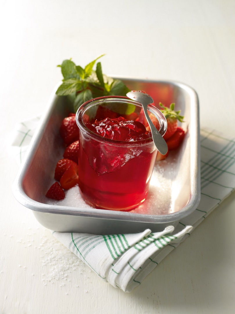 Erdbeersaft in einen Topf geben und mit Diamant Gelierzucker für Gelee vermischen. Minze waschen, dazugeben und unter Rühren zum Kochen bringen.