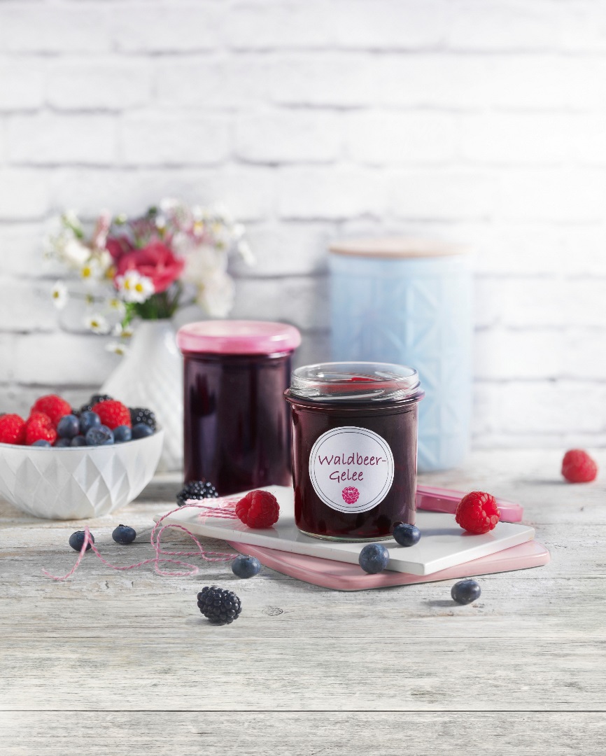 Das fruchtige Quartett aus Himbeeren, Brombeeren, Heidelbeeren und Johannisbeeren vereint sich im Handumdrehen zu diesem köstlichen Gelee-Aufstrich. Ein himmlisch süßer Waldbeeren-Traum.