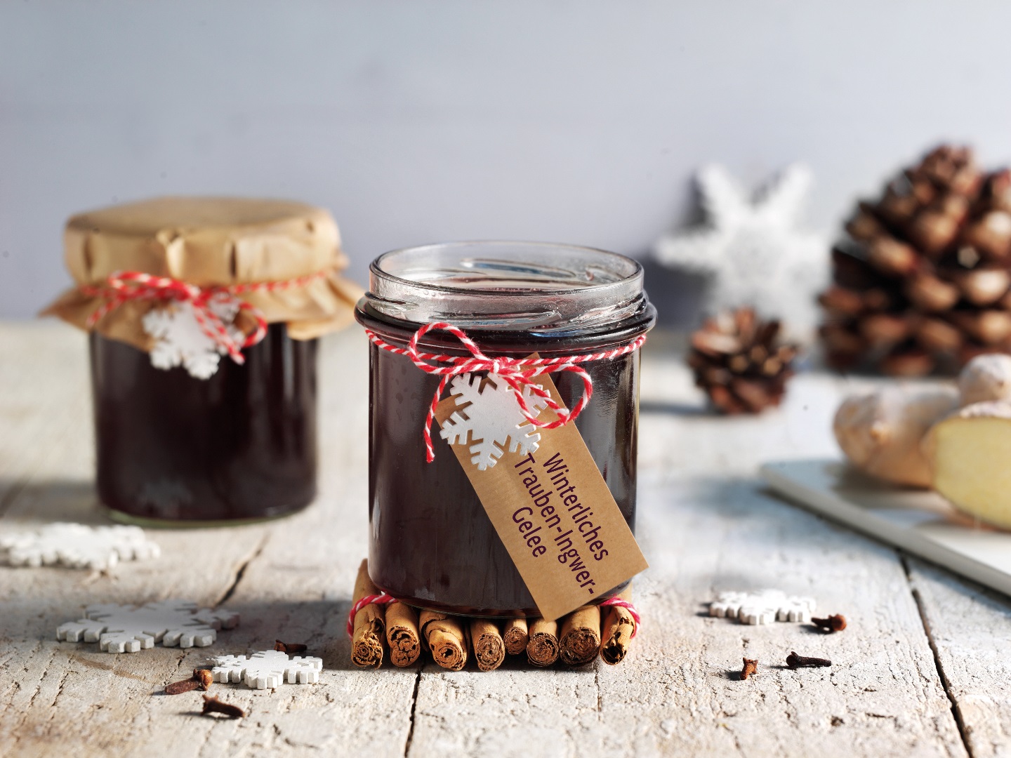 Traubensaft mit Ingwer und Gewürzen in einen großen Topf geben und mit Diamant Gelierzucker für Gelee vermischen. Unter Rühren zum Kochen bringen.